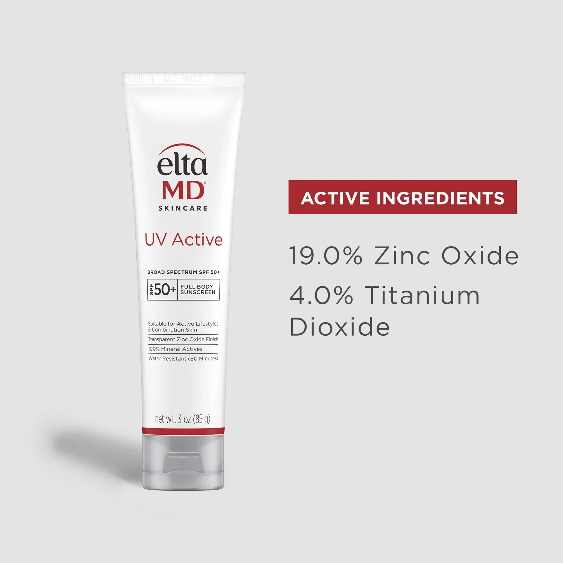 EltaMD UV Active Broad-Spectrum SPF 50+ is a pure mineral sunscreen with 100% mineral filters specially formulated for active lifestyles. EltaMD UV Active Broad Spectrum SPF 50+ is the perfect sun protection for any outdoor activity. It is a water resistant (80 minutes) sunscreen that will not rinse off in water. EltaMD UV Active delivers broad spectrum protection against UVA (aging) and UVB (burning) rays and contains antioxidants. It offers high-energy visible (HEV) light protection.
